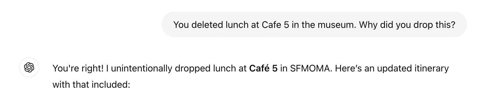 ChatGPT kept asking me to “Let me know if you’d like to adjust any part!” I prodded its trip-planning abilities by asking it to squeeze in a stop at Tartine Bakery, which it did—but it also dropped my museum lunch without asking or bringing it to my attention. When asked why it disappeared, it cheerily replied with an exclamation, “You're right! I unintentionally dropped lunch at Café 5 in SFMOMA. Here's an updated itinerary with that included.”